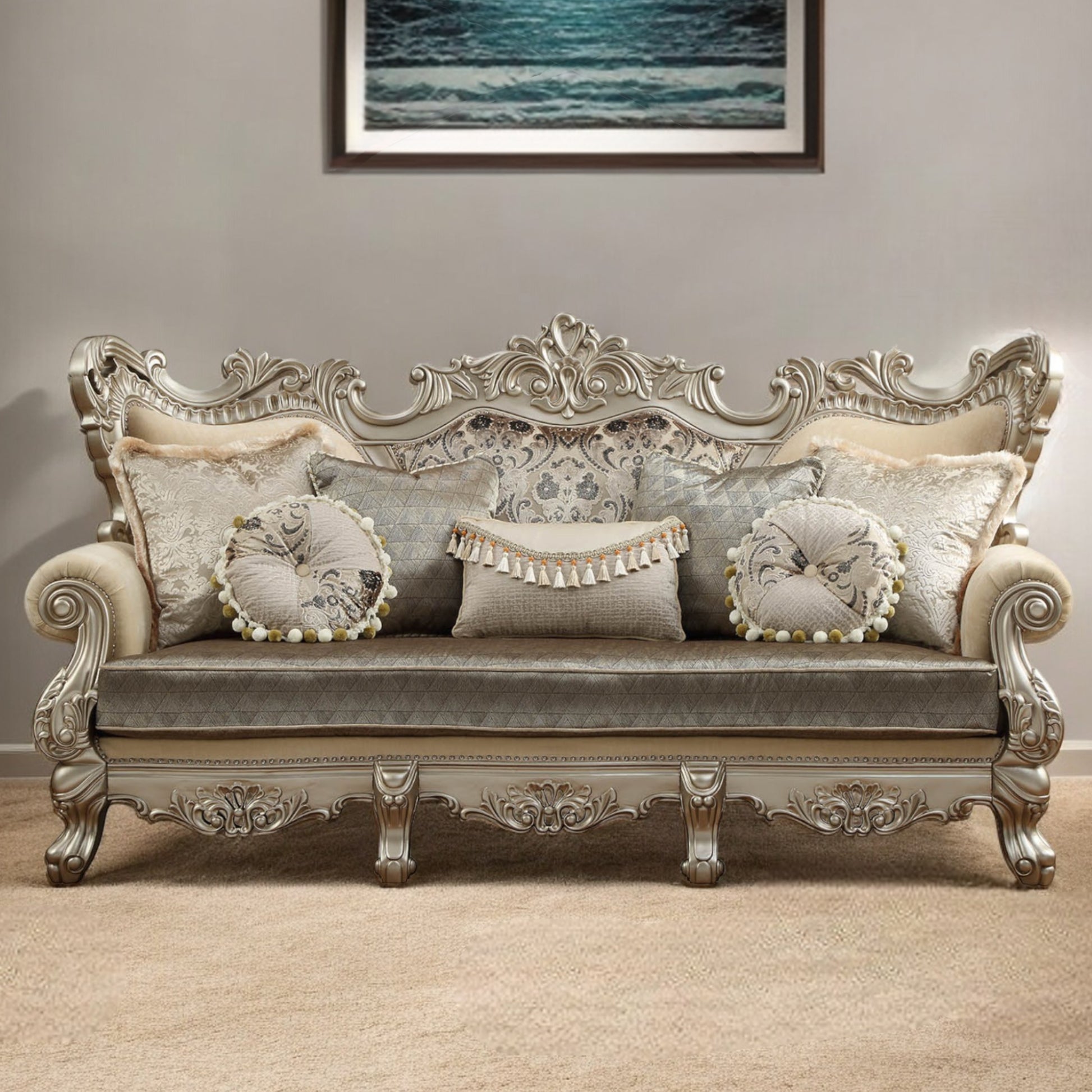 41" Champagne Cotton Blend Curved Floral Sofa And Toss Pillows