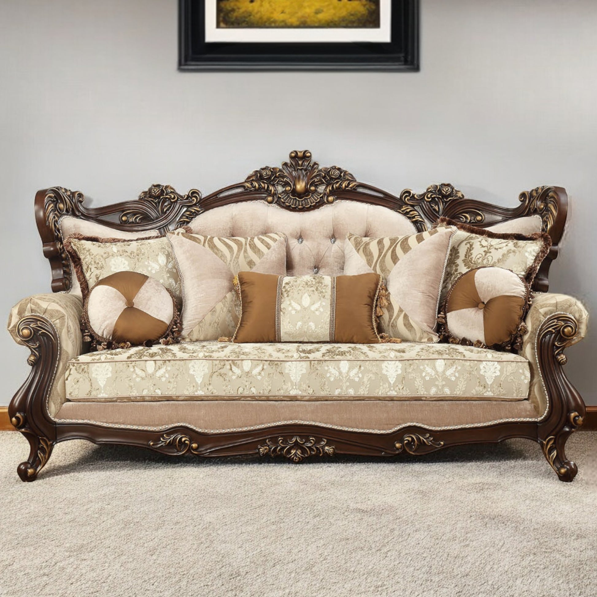 42" Beige Polyester Blend Curved Damask Sofa And Toss Pillows With Brown Legs