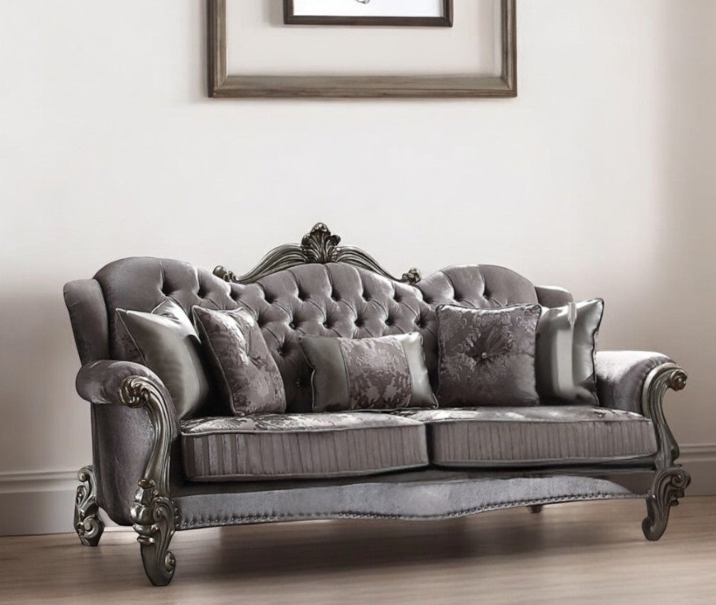 45" Platinum Velvet Floral Sofa And Toss Pillows