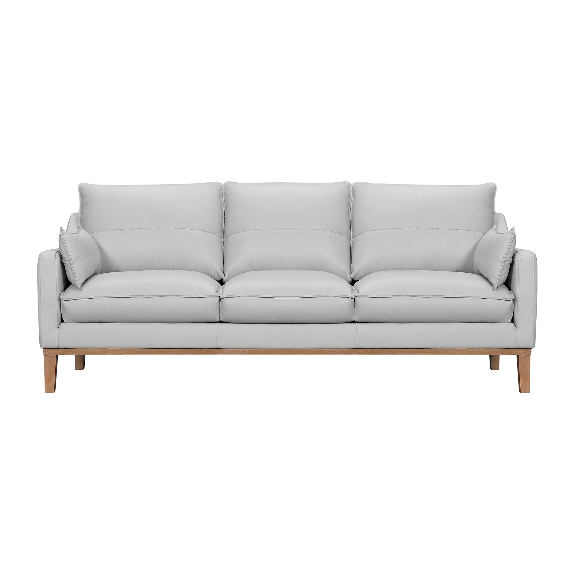 87" Gray Leather Sofa And Toss Pillows With Brown Legs