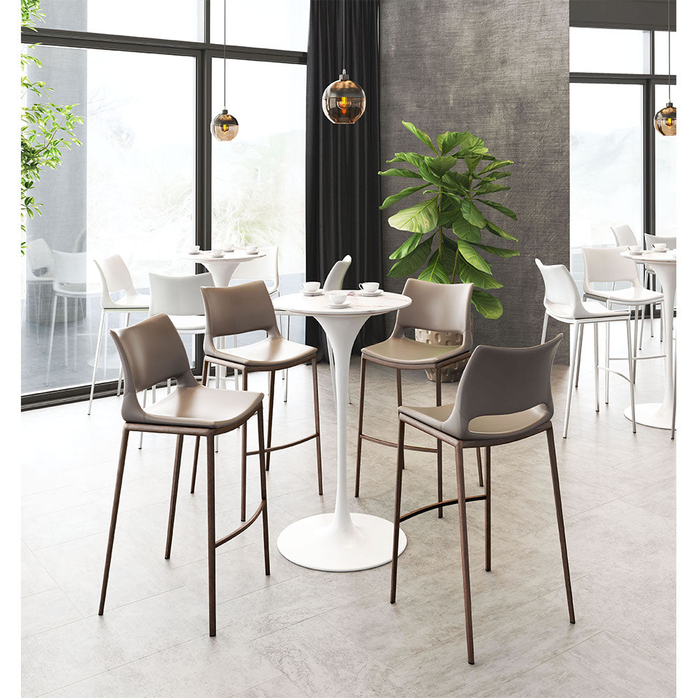 Built for comfort, this ergonomic barstool is the perfect solution for your home or office space. A brushed stainless steel frame plays a supporting role while the built-in curved footrest keeps you firmly planted. The white faux leather seat deck is sleek and modern, making this barstool the perfect complement to any room setting.