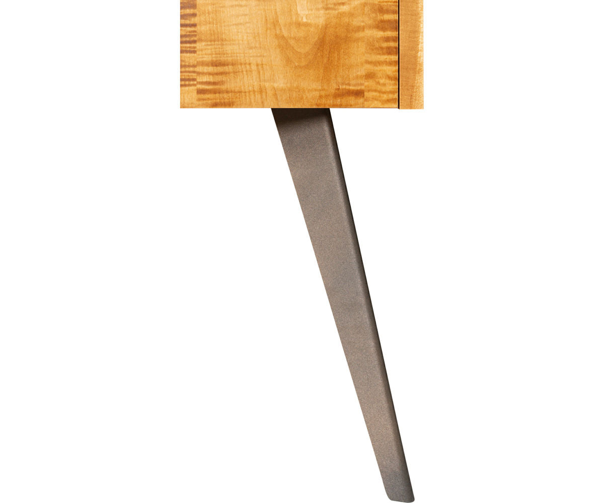 This modern sideboard combines bold natural beauty with industrial strength. Crafted with a 1″ thick beveled Tiger Maple top and set on durable steel legs, it offers both elegance and stability. The design features adjustable shelves behind soft-close doors, providing versatile storage for dining or living spaces. Finished in a warm Sunrise tone with Oil Rubbed Bronze steel, it balances craftsmanship with contemporary style.
