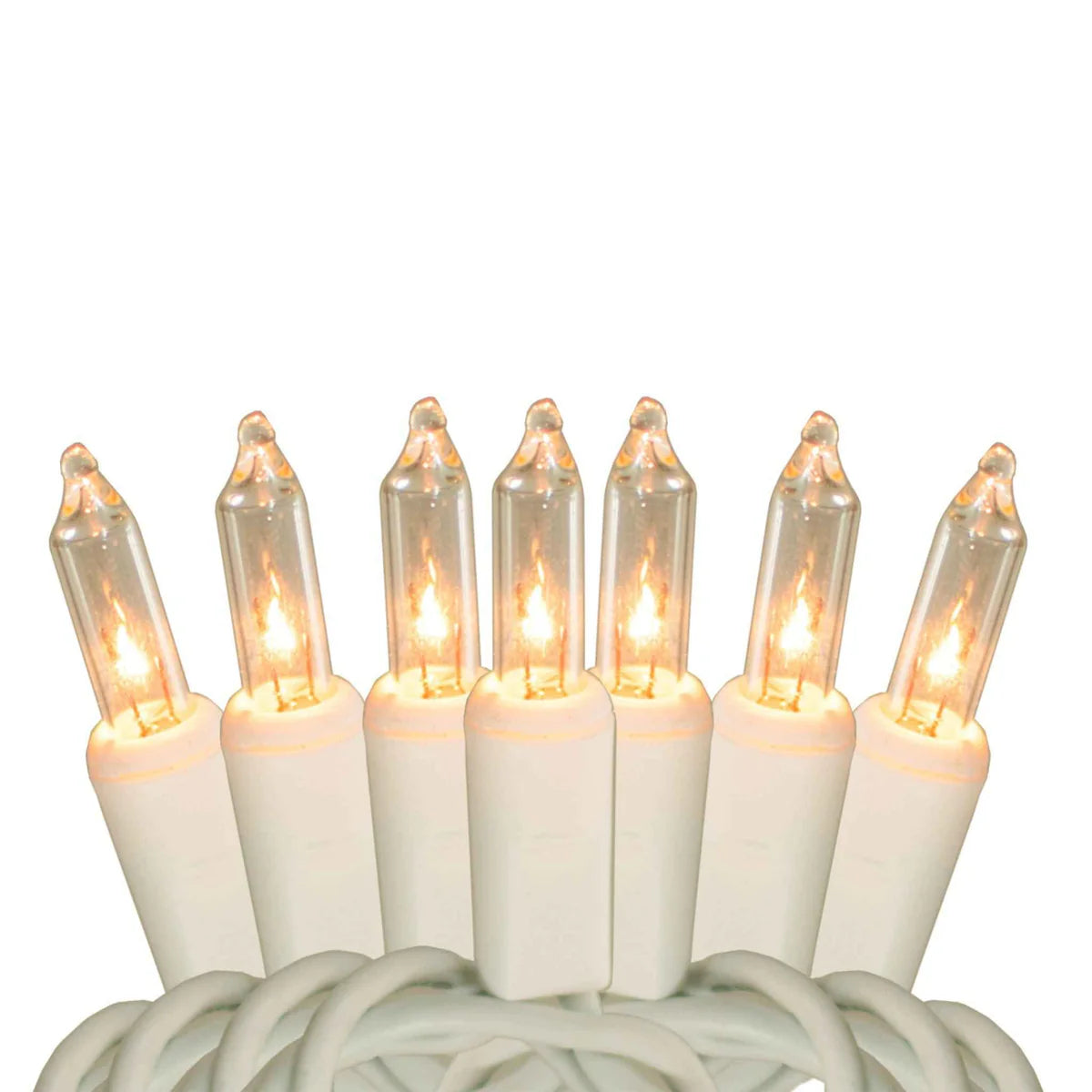 Illuminate your holidays with classic Clear Mini Christmas Light Sets, sold by the case of 25. Each 40FT strand includes 100 incandescent bulbs in a candelabra shape, giving off a warm glowing light that resembles sparkling candles. Available in steady-burning or twinkling options, these lights are perfect for trees, wreaths, garlands, rooftops, and large-scale displays. Built for indoor and outdoor use, they are weather-resistant, water-resistant, and commercial quality to last for many holiday seasons.