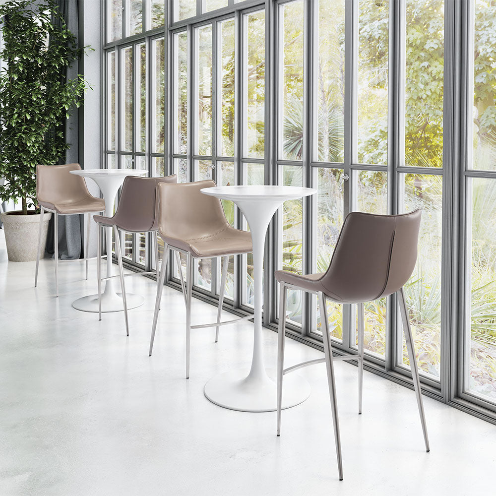 High design meets everyday casual with this handsome barstool. Its slim profile pulls up perfectly to the bar, while the curved seat, upholstered in brown faux leather with dramatic stitching, delivers both comfort and style. Supported by brushed stainless steel legs with protective plastic feet, it ensures strength, stability, and scratch-free floors.