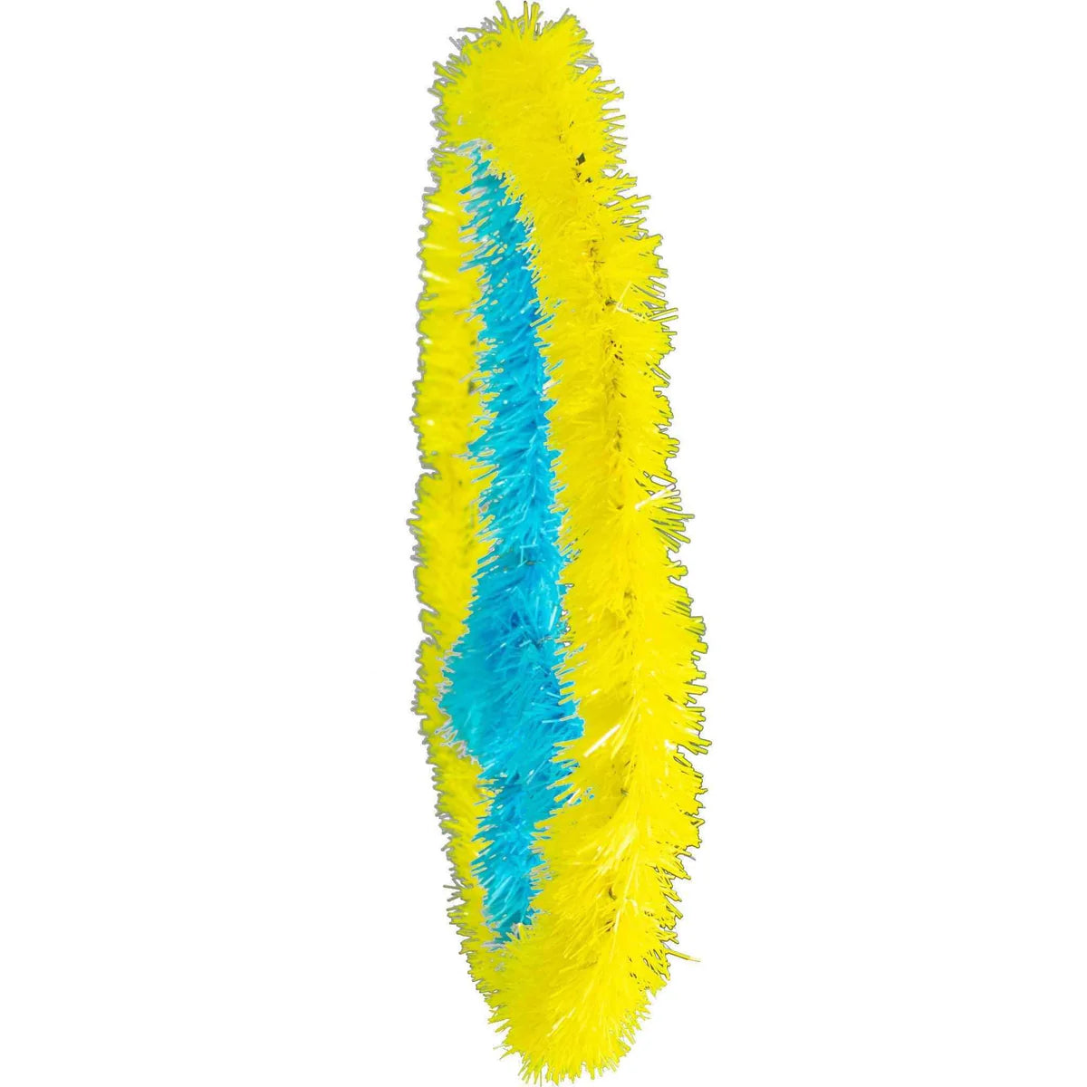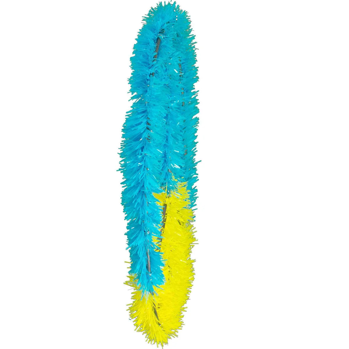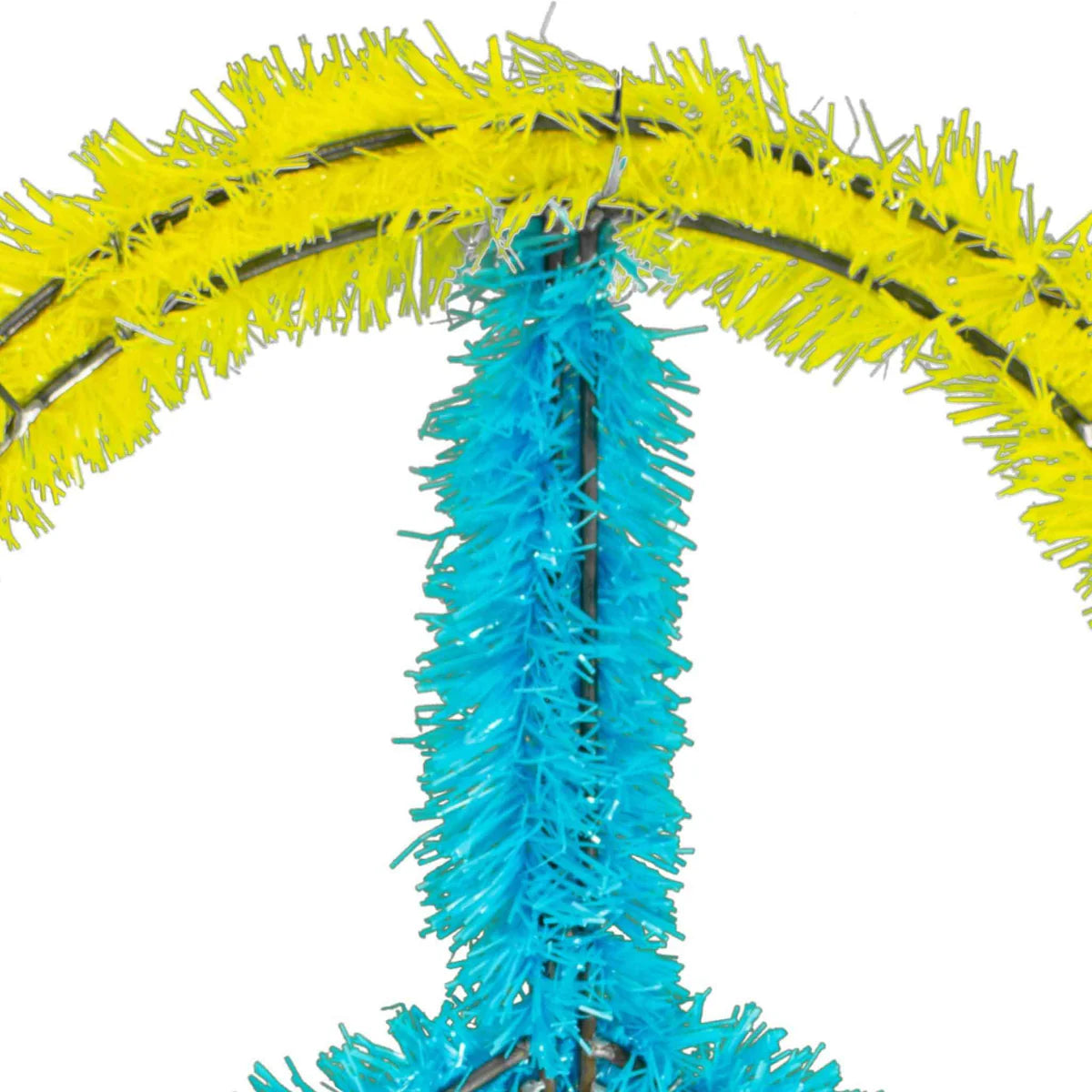 This 22-inch peace symbol wreath is designed to show support for Ukraine with a vibrant blue and gold tinsel finish. Crafted on a double-supported steel frame, it features a single-sided design that lies flat against walls, windows, or ceilings. Lightweight yet durable, the wreath is pre-assembled and ready to hang, offering an easy and meaningful way to display your support. A portion of the proceeds is donated to a nonprofit organization providing humanitarian aid to Ukraine.