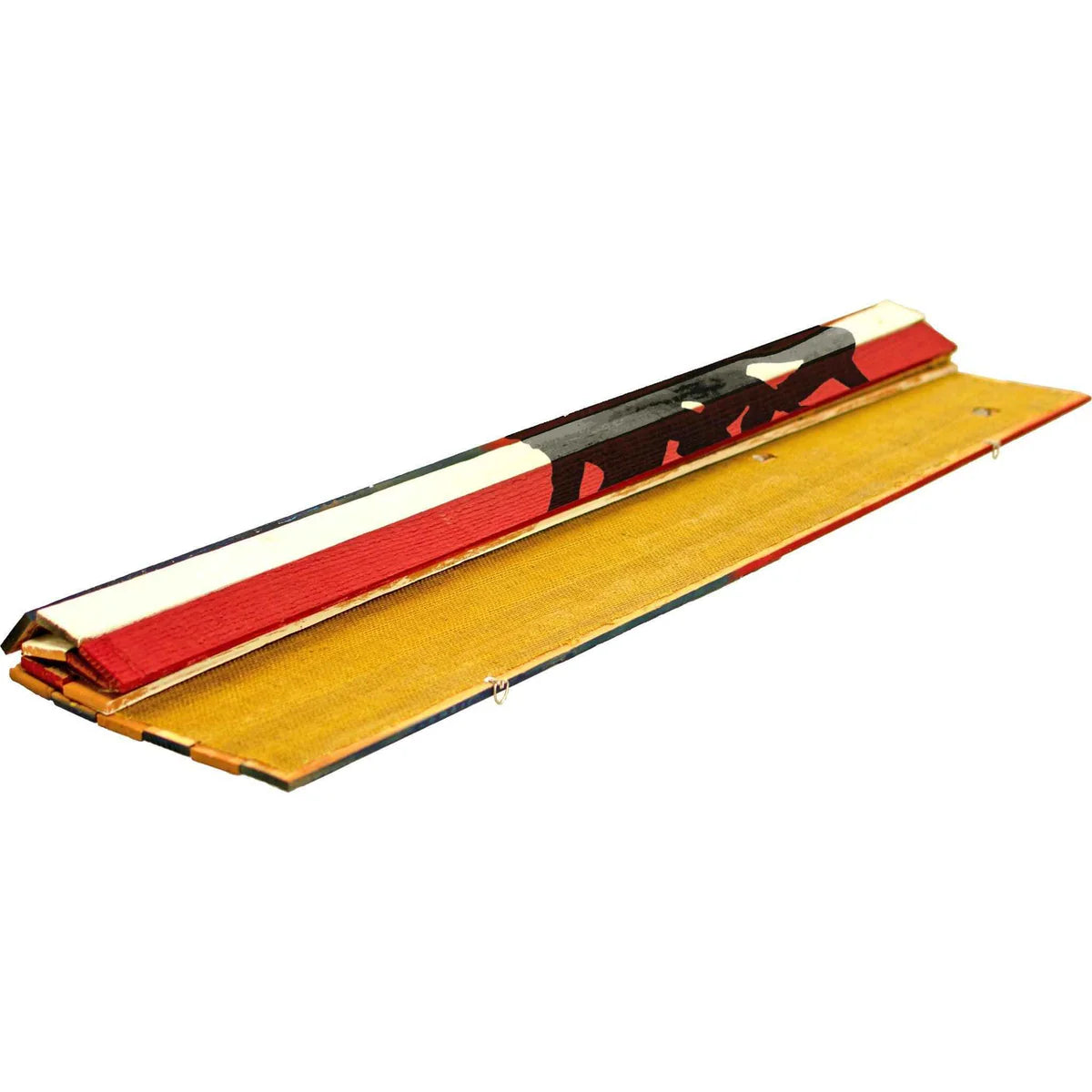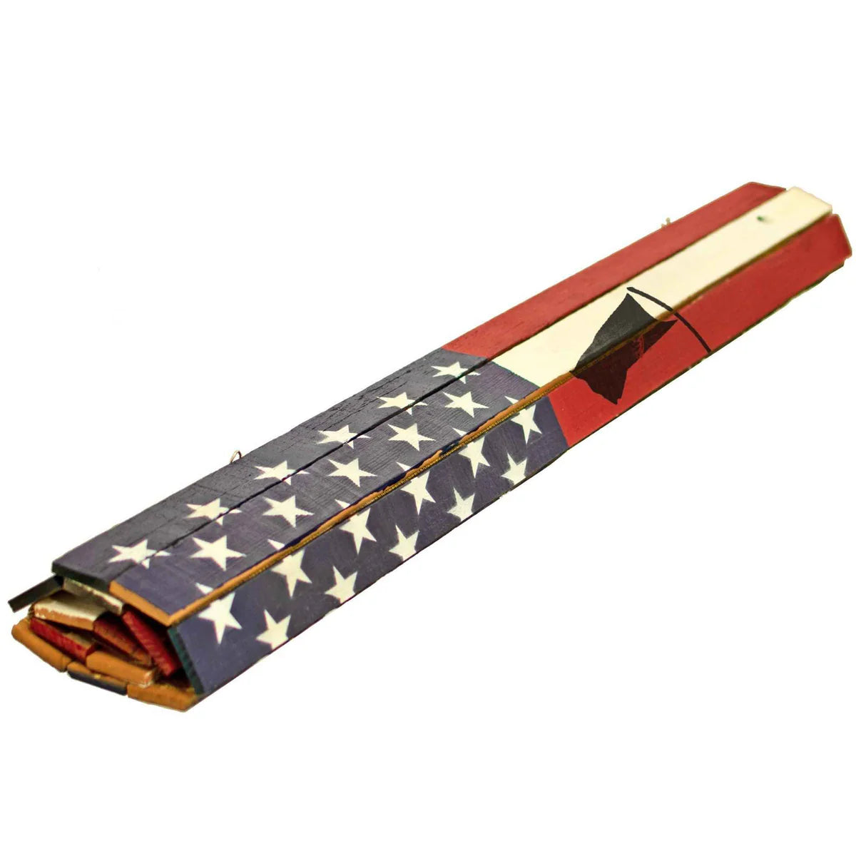 • 13 stripes crafted from red and white redwood slats, sealed with brown burlap