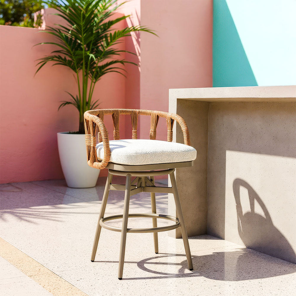 Designed for both style and functionality, the Safal Swivel Barstool in Multicolor is made from durable 100% polyester outdoor fabric, powder coated aluminum, and 100% polyethylene synthetic rattan weave. Its modern design is perfect for hospitality use, enhancing any seating area.