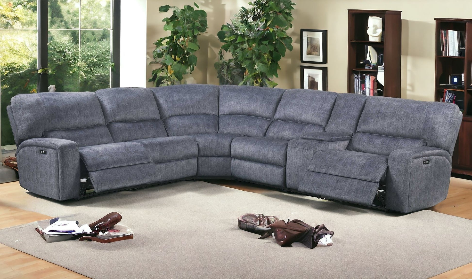 Slate Blue Velvet Power Reclining L Shaped Six Piece Corner Sectional With Console