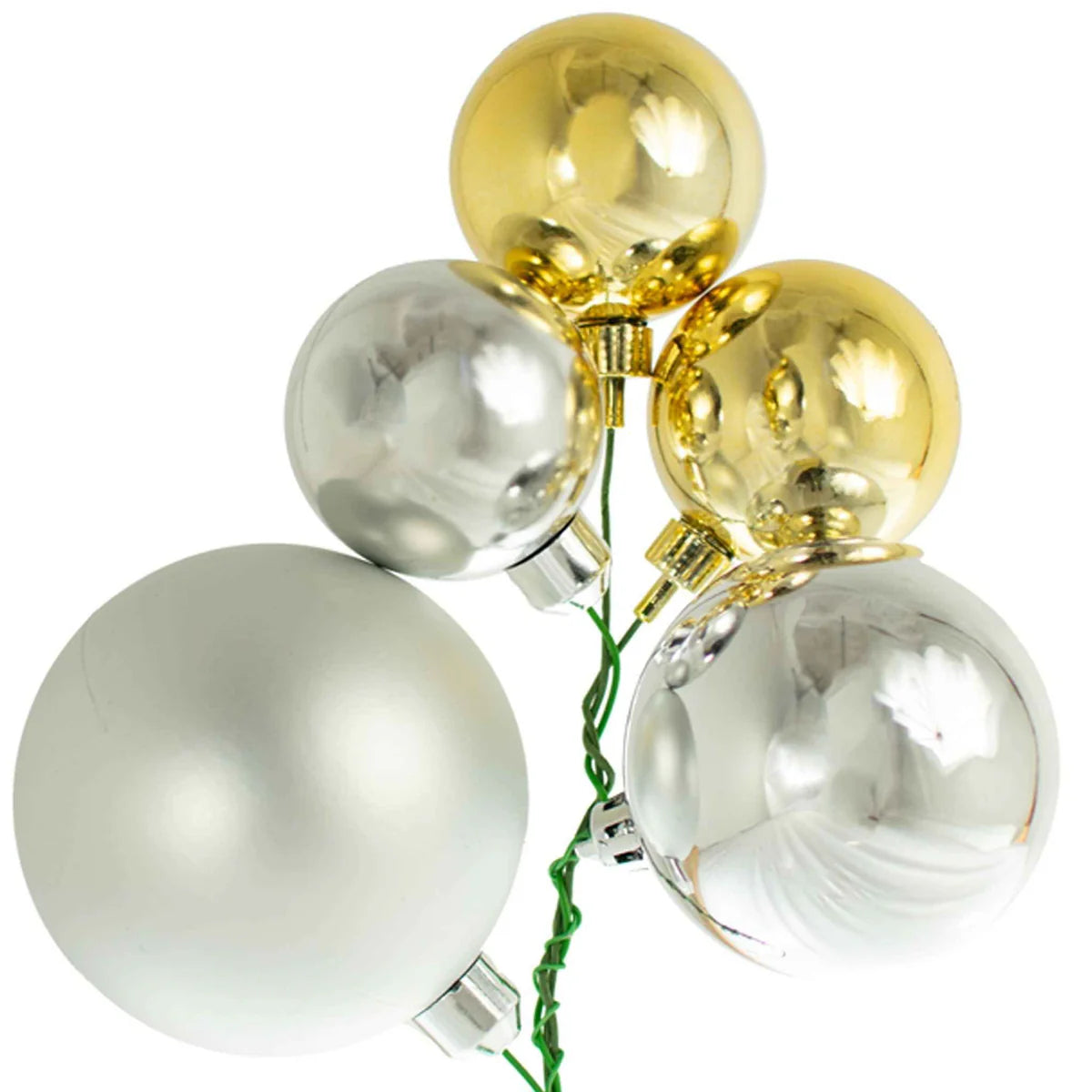 Add elegance to your holiday décor with the Fremont Christmas Ball Ornament Clusters featuring a mix of shiny and matte silver paired with rich gold ornaments. Designed for quick and easy decorating, each cluster comes pre-tied and ready to hang on trees, garlands, wreaths, mantles, or door frames. Durable and shatterproof, these clusters are built for long-lasting seasonal charm indoors or outdoors.