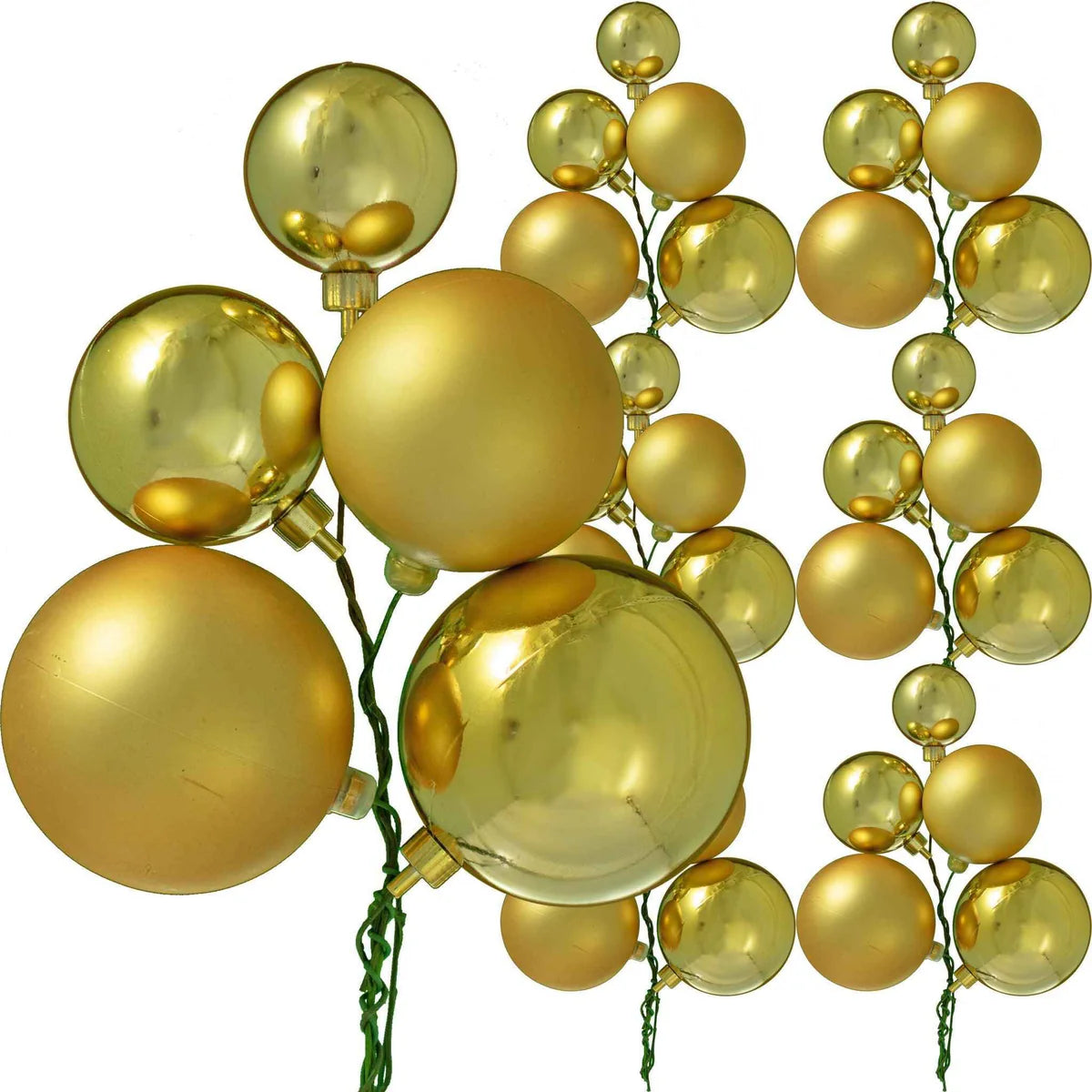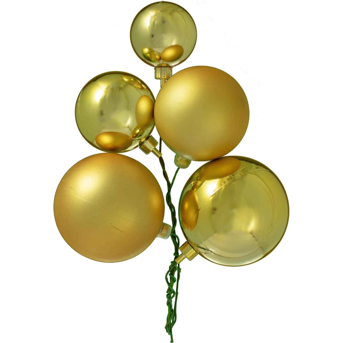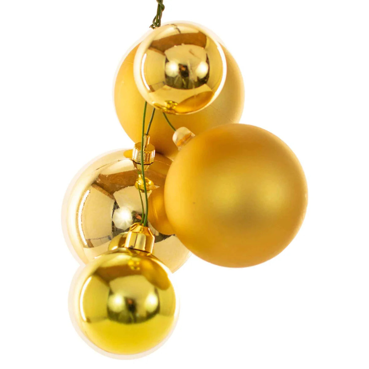 The Fresno Christmas Ball Ornament Cluster makes holiday decorating faster and more festive. Designed with pre-tied clusters of shiny and matte gold ornaments, each bundle is ready to attach to trees, garlands, wreaths, or mantles using the included 6-inch hanging wire. Hand-assembled and permanently secured for durability, these clusters bring a professionally styled look to your holiday décor while saving time. Made with shatterproof PVC, they are built to withstand both indoor and outdoor use for years to come.
